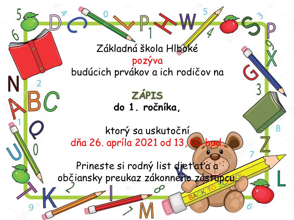 zápis žiakov do prvého ročníka na školský rok 2021/2022 sa bude konať 26. apríla 2021