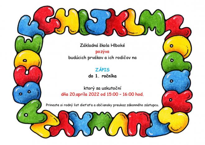 zápis žiakov do prvého ročníka na školský rok 2022/2023 sa bude konať 20. apríla 2022